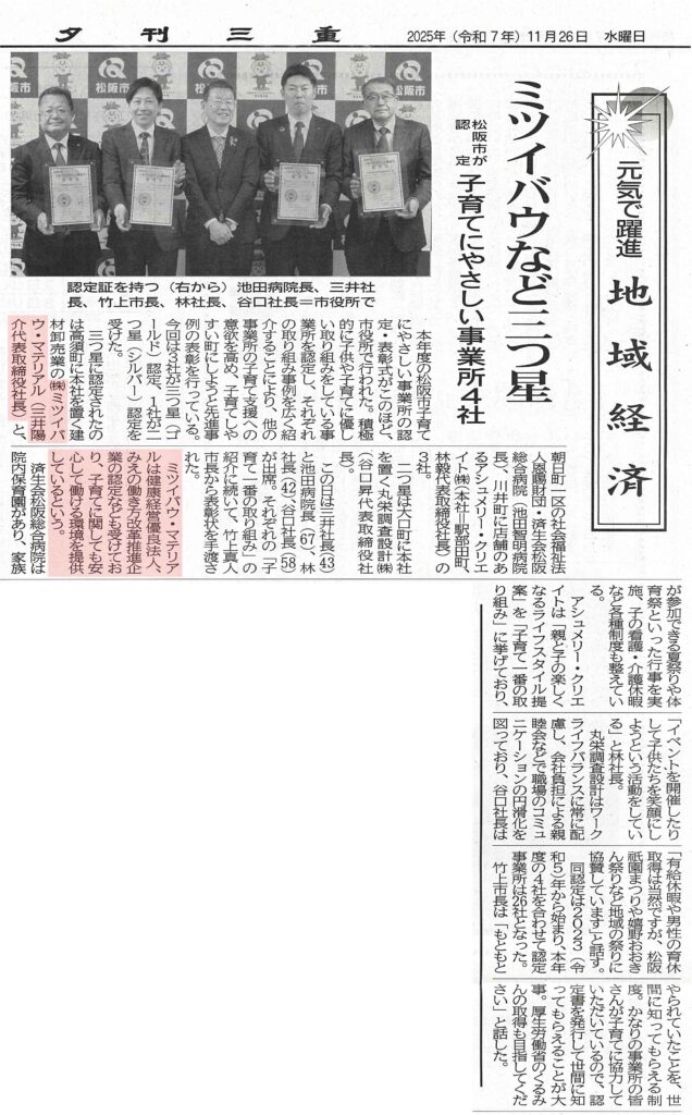 2025年11月26日付の夕刊三重様にて、松阪市が行う『令和7年度 子育てにやさしい事業所』認定制度が紹介され、当社も最高評価である“三ツ星”を受けた事業所として掲載いただきました。